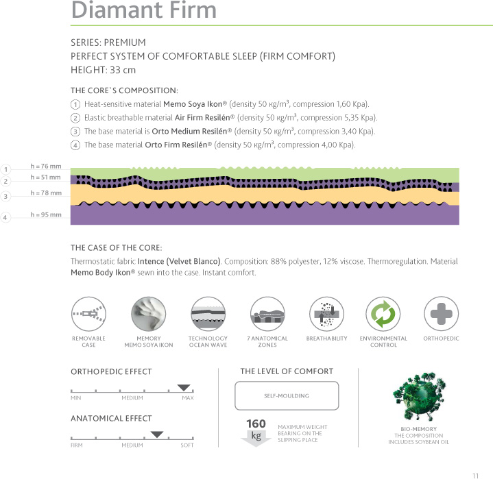 Due to the unique design of the mattresses core this mattress provides the most correct position of the spine combined with high anatomic effect and perfect comfort for any person regardless of height and weight. the mattress is made according the perfect formula Comfort - soft anatomical upper layers of material with a memory effect and lower layers of the orthopedic bearing carrier base material Orto resilen®. the carrier base made of materials (lower layer 2) with high compression in combination with soft anatomical upper layers creates an ideal orthopedic support and a high quality comfort.