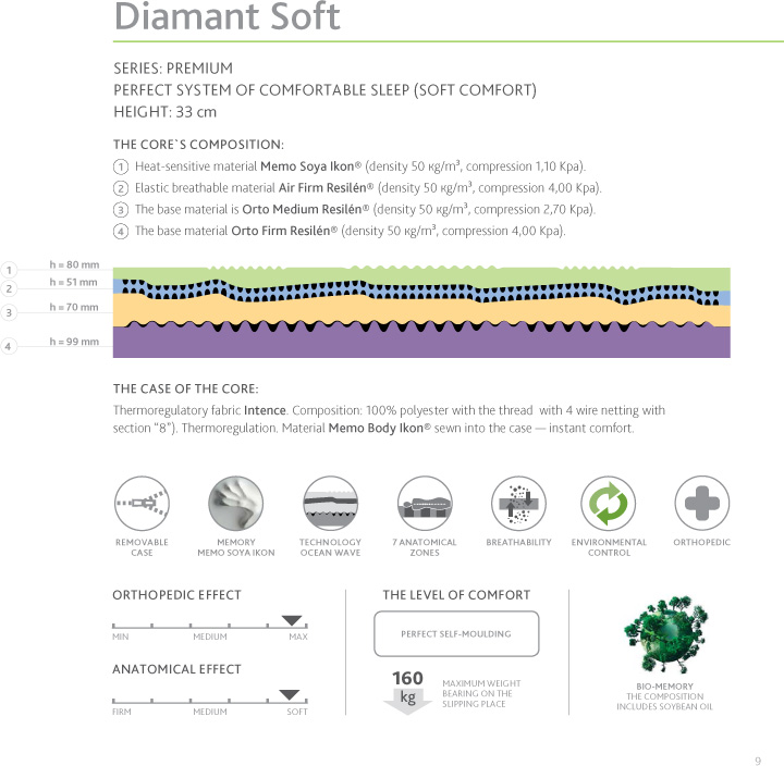 The core of the mattress is made with use of Ocean Wave technology which allows to adapt the mattress under the physiological curves of the human body. thanks to unique design of the core this mattress provides the most correct position of the spine combined with high anatomic effect and perfect comfort for any person regardless of height and weight. the mattress is made according to the perfect formula «Comfort» — soft anatomical upper layer made of material with a memory effect and lower layer of the orthopedic bearing carrier base material Orto resilen®. the carrier base made of materials (2 lower layers) of high compression and combined with soft anatomical upper layers creates an ideal orthopedic support with a high quality service.