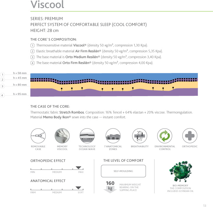 VISCOOL — unique material based on soybean oil with memory effect and cooling effect. the use of this material in mattress core provides the user with maximum comfort with a high anatomic and cooling effect. The core of the mattress is made with use of Ocean Wave technology, which allows to adapt the mattress under the physiological curves of the human body. due to the unique design of the core — this mattress provides the most correct position of the spine combined with high anatomic effect and perfect comfort for any person regardless of height and weight. the mattress is made according the perfect formula «Comfort» — soft anatomical upper layers made of material with a memory effect and lower bearing layers made of the orthopedic base material Orto resilen®. the core of mattress is made of materials (lower layer 2) of high compression, combined with soft anatomical upper layers creates an ideal orthopedic support a high quality of comfort. The division of the core on 7 anatomic zones gives maximum ergonomics and adaptation of the mattress in places with considerable weight loads. Thermostatic Case (intenCe tissue) creates a comfortable microclimate in the mattress surface. this is achieved by high breathability and capillarity of the absorbent properties of the tissue.