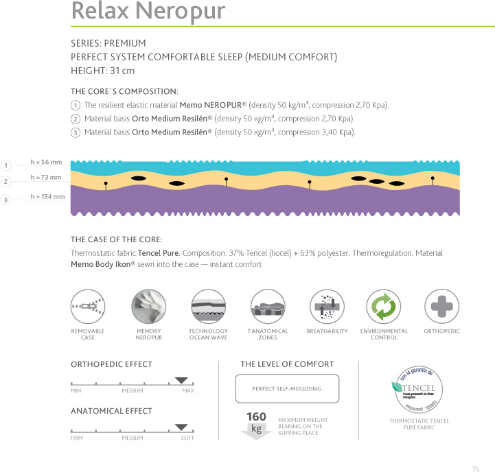 Unique material nerOpUr with oil flowers of the bitter orange has high strength and elasticity. Fresh oranges and honey flavor nerOpUr acts as an antidepressant, relieves stress and combats insomnia. the core of the mattress is made with use of Ocean Wave technology, which allows to adapt the mattress under the physiological curves of the human body. due to the unique design of the core - this mattress provides the most correct position of the spine combined with high anatomic effect and perfect comfort for any person, regardless of height and weight. the mattress is made according the perfect formula Comfort — soft anatomical upper layers of material with nerOpUr effect of memory and lower support layers orthopedic bases Orto resilen® material. the division of the core of the mattresses on 7 anatomic zones gives maximum ergonomics and adaptation of the mattress in the places with significant weight loads. thermostatic Case (tenCeL fabric) creates a comfortable microclimate in the mattress surface. this is achieved by high breathability, capillarity and absorbent properties of the tissue.