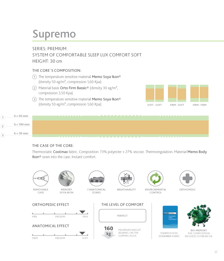 Precisely calculated combination of three different layers of comfort and division of the core into orthopedic zones makes this mattress versatile and suitable to the majority of users because of its orthopedic and anatomical properties. the mattress is made according the perfect formula Comfort — soft anatomical upper layers of material with a memory effect and lower layers of the orthopedic bearing carrier base material Orto resilen®.the carrier base made of the material with high compression combined with soft anatomical upper layer creates an ideal orthopedic support with a high level of comfort.