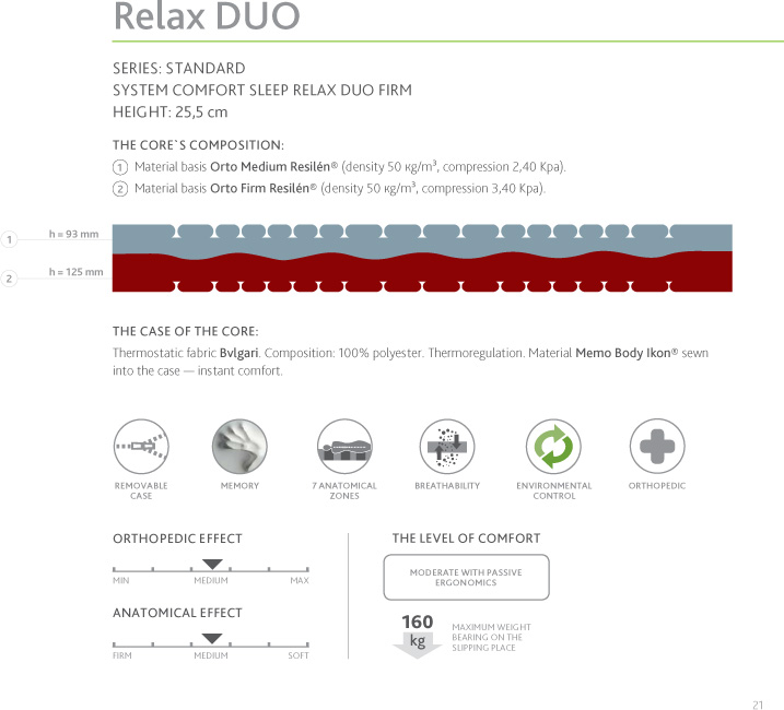 Thick springless mattress for fans of hard and moderate comfort. the core of mattress is made of a combination of two Orto materials with a high weight load and elasticity. the mattress is not deformed and allows the spine to take a natural position with reasonable comfort. the mattress is double sided — the two sides of comfort — moderate and hard .