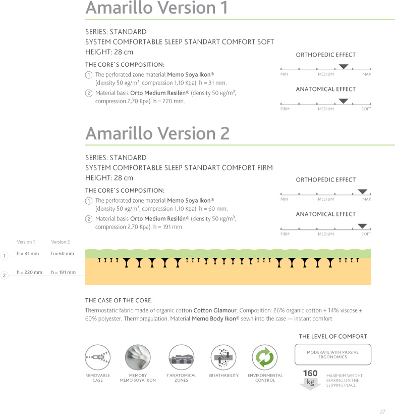 Precisely calculated combination of two layers of different сomfort and the division of the core on the orthopedic zones makes this mattress versatile and suitable for the majority of users due to it`s orthopedic and anatomical properties the mattress is made according the perfect formula «Comfort» — soft anatomical upper layers of material with a memory effect and lower layers of the orthopedic bearing carrier base made of material Orto resilen®. the basis for carrying of the high compression in combination with a soft upper layer creates the perfect orthopedic support with a high quality comfort.