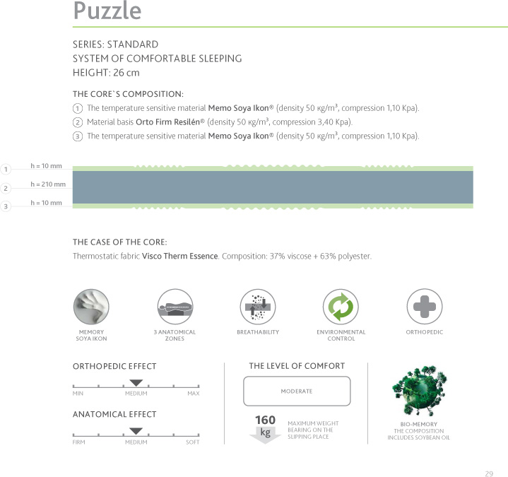 A mattress with orthopedic effect and a moderate level of comfort. anatomical layer of material with a memory effect which is sewn into the mattress cover gives a sense of comfortable sleeping. moderate without excess pressure spine`s support is provided by the carrier layer material Orto firm resilén®. the mattress is recommended for people who prefer the mattress of medium hardness. Unique firmware of the mattress cover combined with memo soya ikon® material provides an easy massage effect and prevents numbness of soft tissue.