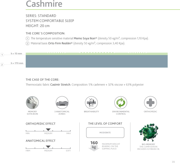 the structure of mattress`s core provides the correct position of the spine, regardless of weight and height of the user. the bottom layer of the core is responsible for the orthopedic support, comfortable top layer helps to relax the muscles and facilitates to a free blood and lymph circulation. thick springless mattress but with a fairly high level of comfort. recommended for all (age, weight, height, sex) users, because the materials wich are used perfectly distribute weight load and provide elastic support for the spine. thermostatic cover with addition of cashmere provides a comfortable microclimate for sleep.